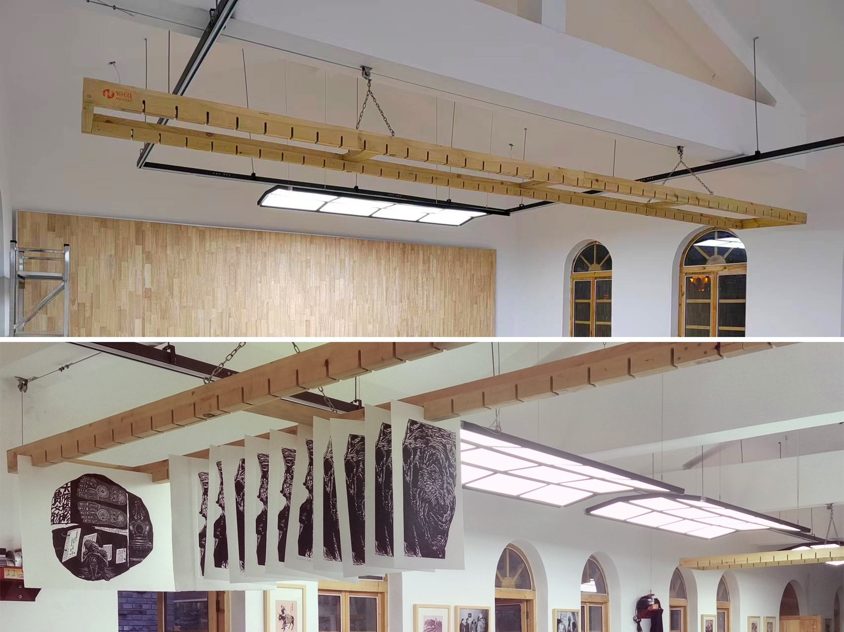 主體機構采用木質材料(可定制鋁合金材料),手持式電機升級按鈕控制,節省空間,防止蹭臟,便于展示。 晾畫架長4米,雙邊有86個晾畫卡槽。 用電:220V 510W ※可定制不同規格尺寸。 |